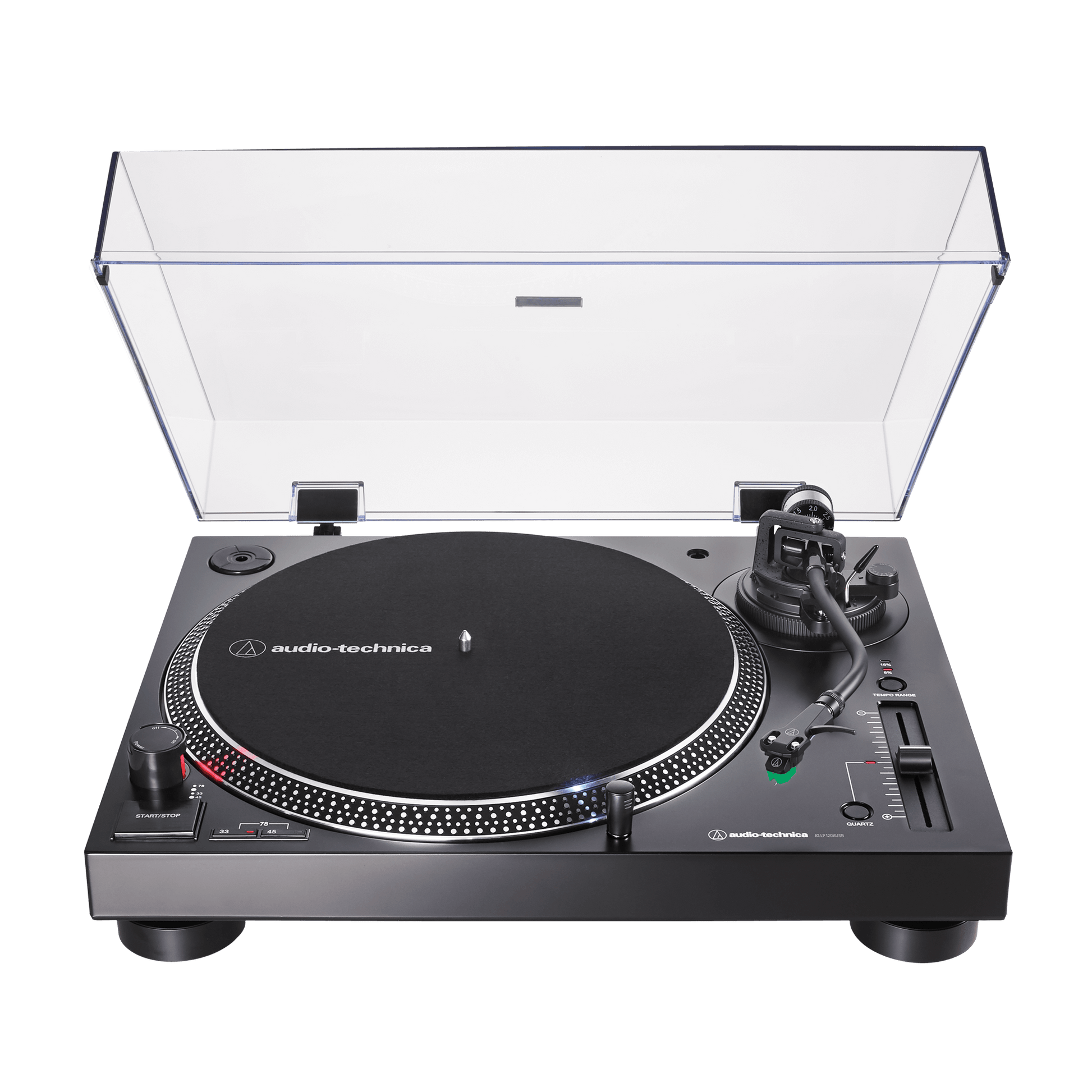 The turntable features an S-shaped tonearm with adjustable tracking force and an AT-HS6 universal ½"-mount headshell with an AT-VM95E Dual Magnet™ phono cartridge. Audio-Technica has been a leader in phono cartridge design for more than 50 years, and that expertise shows in the versatile, high-performance AT-VM95E cartridge, which comes with a 0.3 x 0.7 mil elliptical stylus, but is also compatible with any VM95 Series replacement stylus, offering a wide choice of options for every budget and application.