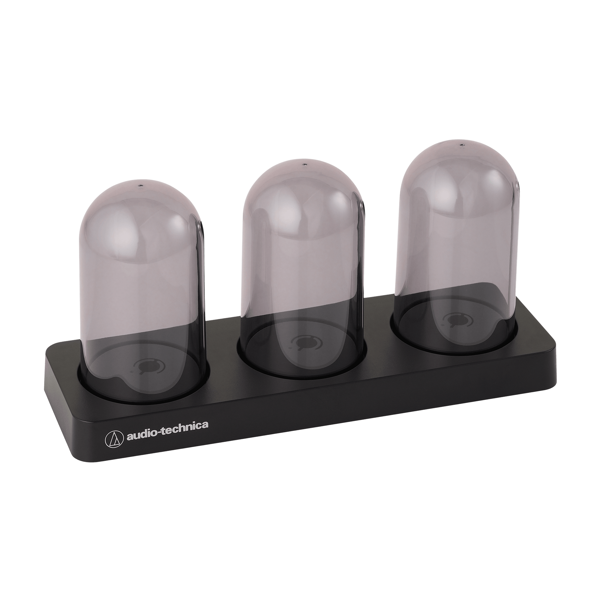 The AT6003R is designed to store three sets of headshells with mounted phono cartridges. The case holds the headshells securely in an upright position and includes three UV-protected capsules to cover the headshells/cartridges. A slit in the side of each capsule accommodates the headshell’s finger lift. Rubber feet on the bottom of the case provide increased stability.